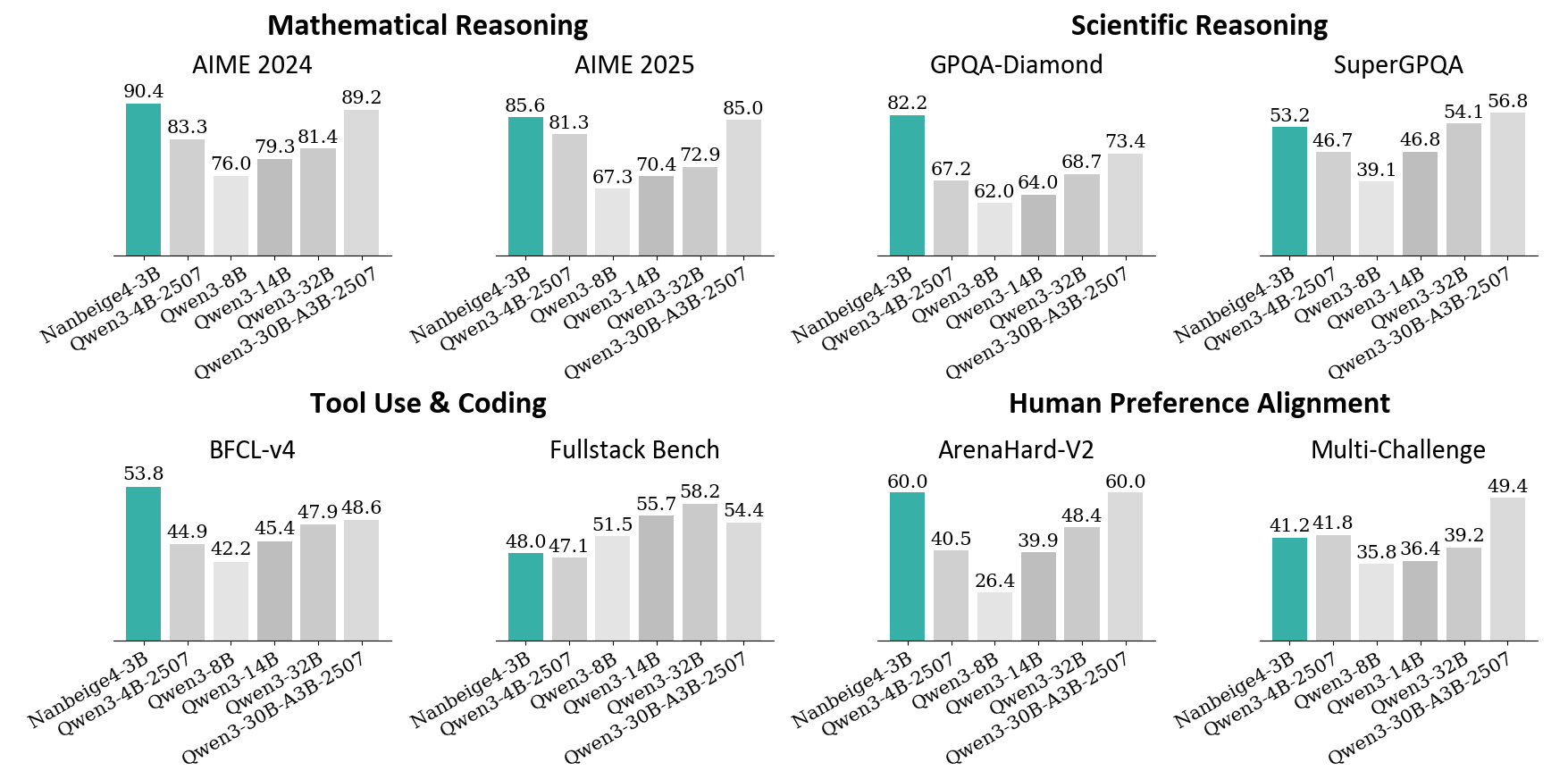 Nanbeige4-3B-Thinking-2511 is an enhanced iteration over our previous Nanbeige4-3B-Thinking-2510. Through advanced knowledge distillation techniques and targeted reinforcement learning (RL) optimization, we have significantly scaled the model’s reasoning capabilities, delivering stronger and more reliable performance on diverse challenging benchmarks. This version establishes new state-of-the-art (SOTA) results among open models under 32B parameters on AIME, GPQA-Diamond, Arena-Hard-V2, and BFCL-V4, which marks a major milestone in delivering powerful yet efficient reasoning capabilities at a compact scale.
