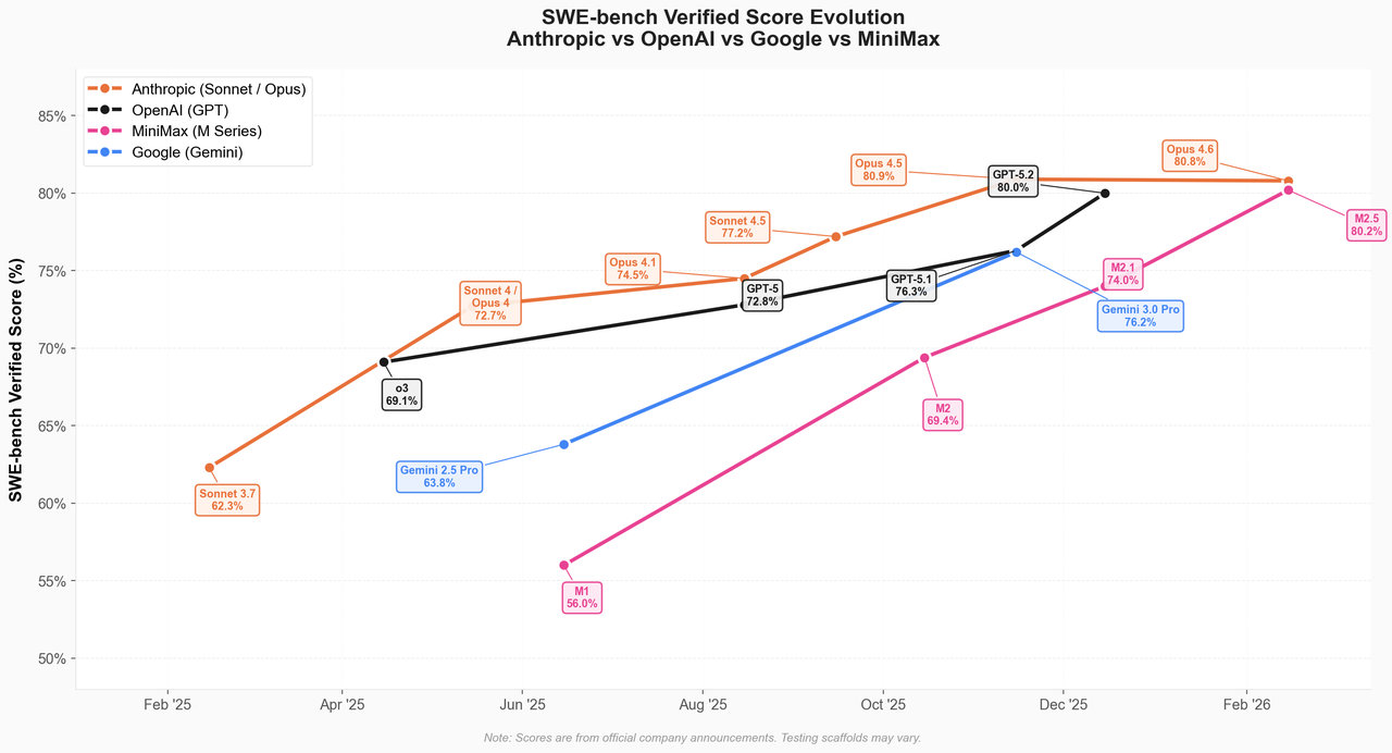 Over the three and a half months from late October to now, we have successively released M2, M2.1, and M2.5, with the pace of model improvement exceeding our original expectations. For instance, in the highly-regarded SWE-Bench Verified benchmark, the rate of progress of the M2-series has been significantly faster than that of peers such as the Claude, GPT, and Gemini model families.