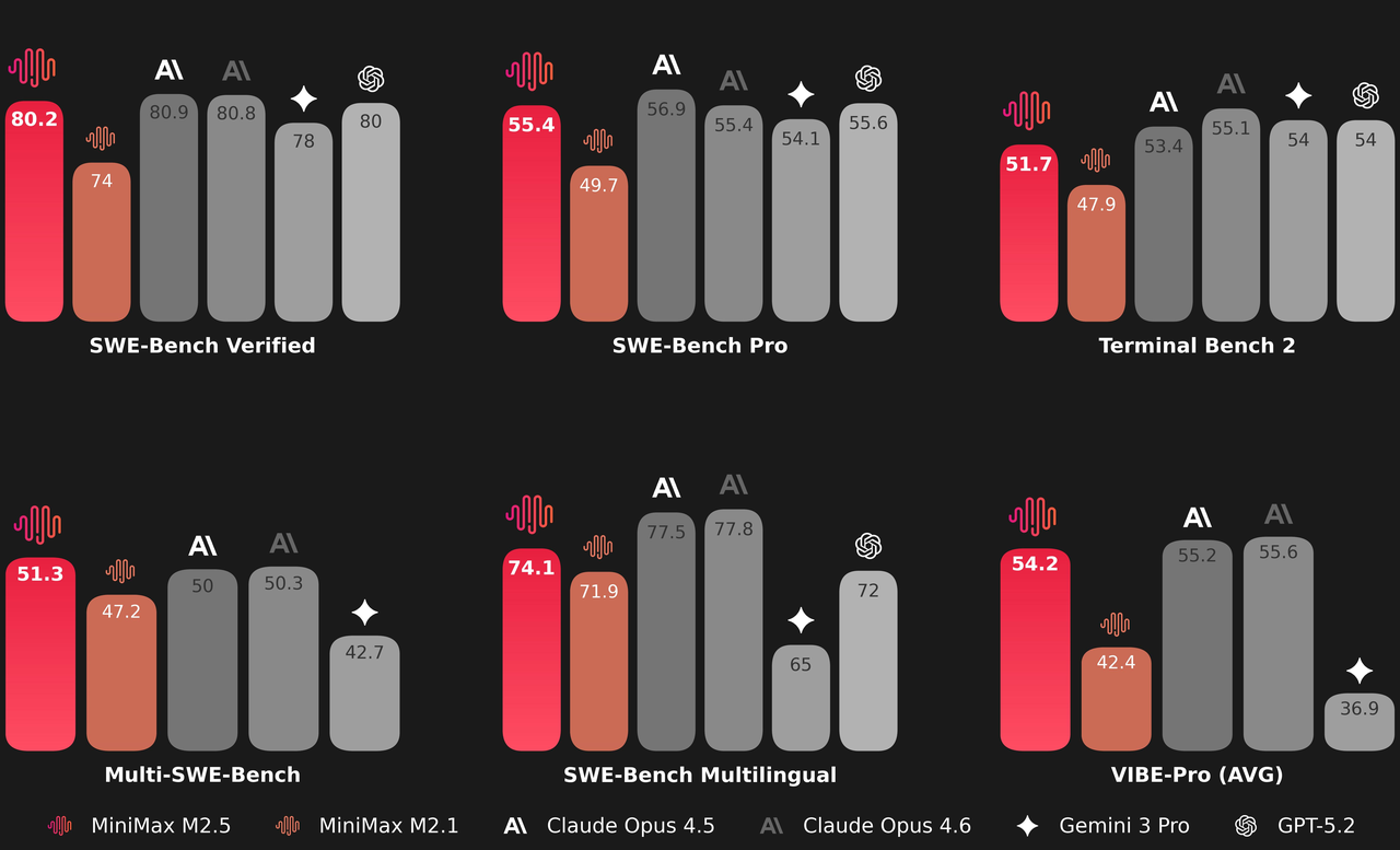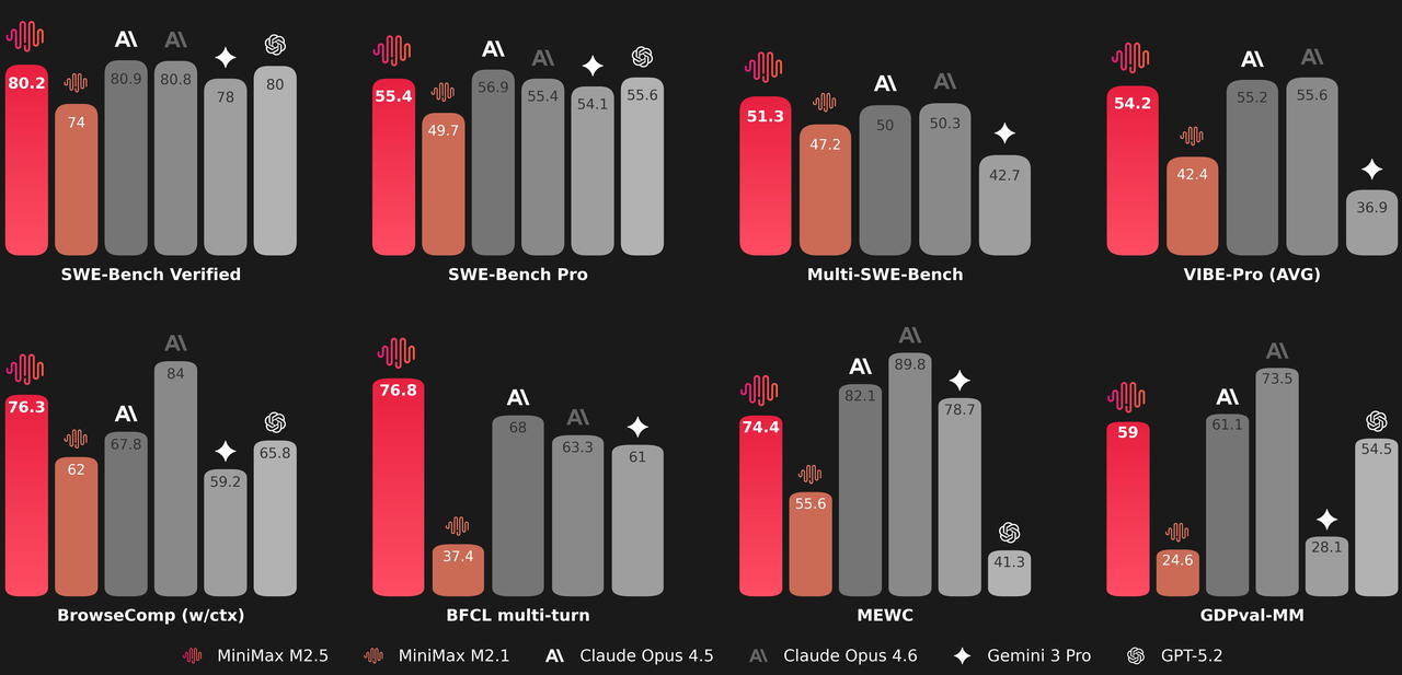 Extensively trained with reinforcement learning in hundreds of thousands of complex real-world environments, M2.5 is SOTA in coding, agentic tool use and search, office work, and a range of other economically valuable tasks, boasting scores of 80.2% in SWE-Bench Verified, 51.3% in Multi-SWE-Bench, and 76.3% in BrowseComp (with context management).