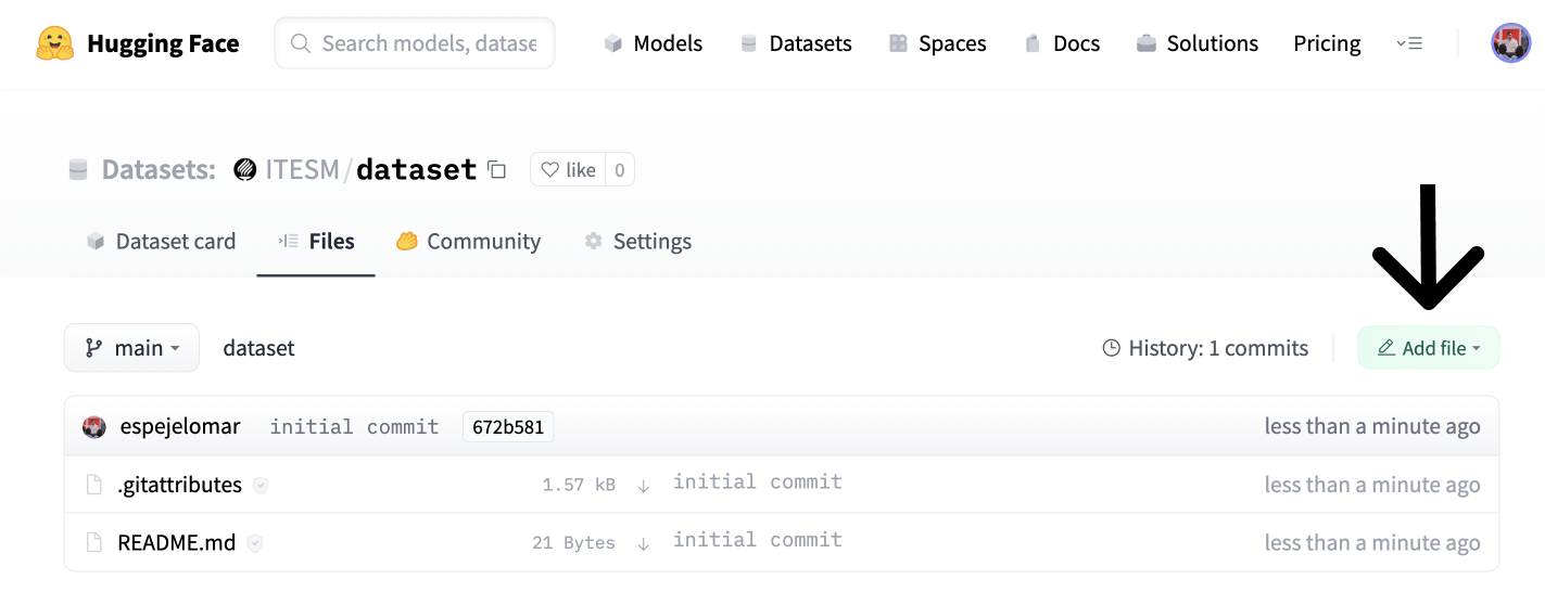 🤗 Datasets is a library for quickly accessing and sharing datasets. Let's host the embeddings dataset in the Hub using the user interface (UI). Then, anyone can load it with a single line of code. You can also use the terminal to share datasets; see the documentation for the steps. In the notebook companion of this entry, you will be able to use the terminal to share the dataset. If you want to skip this section, check out the ITESM/embedded_faqs_medicare repo with the embedded FAQs.