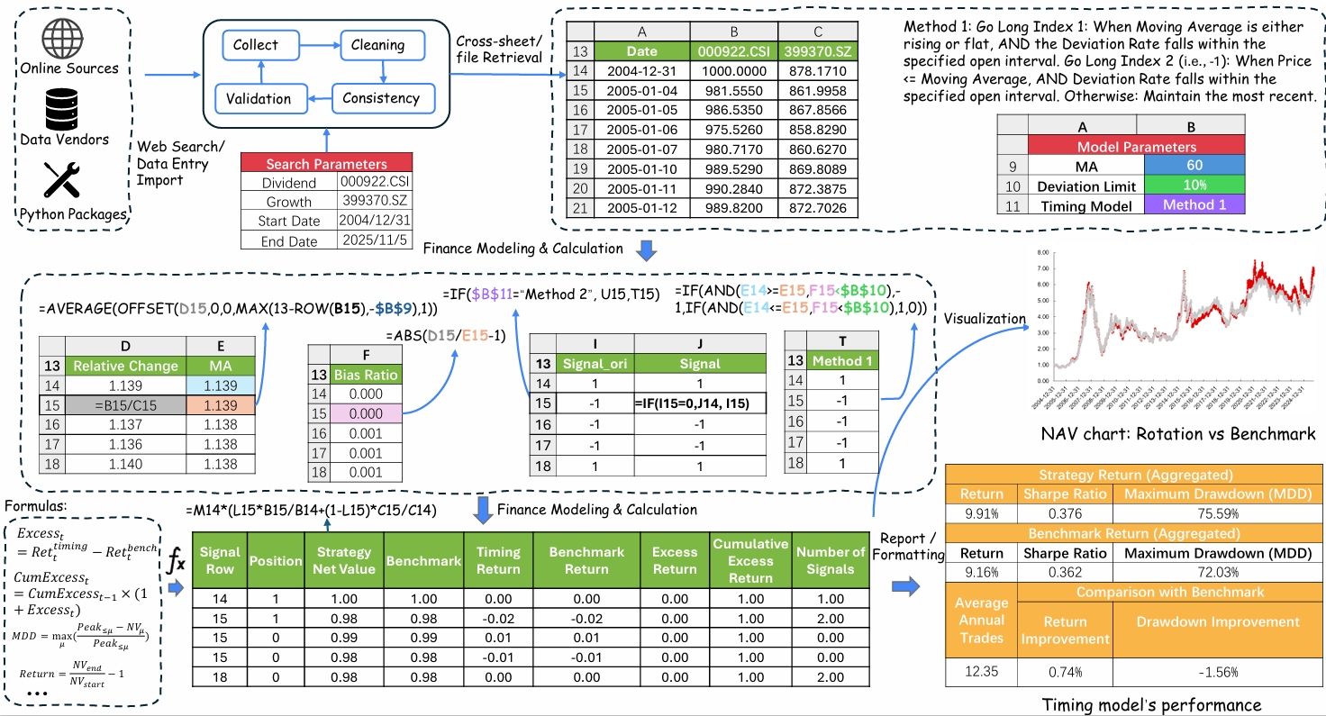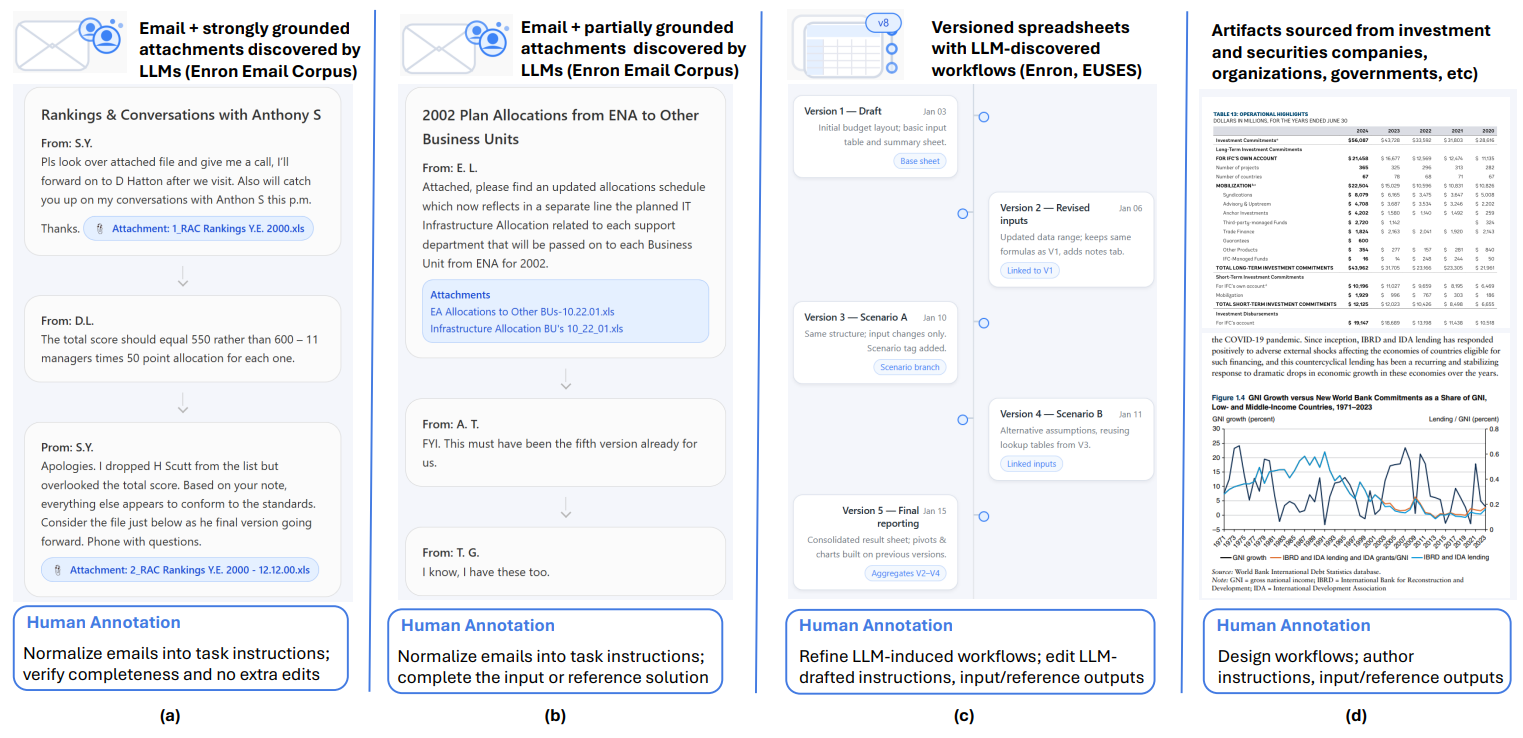 --- license: cc-by-3.0 tags: - agent - workflow - multimodal - spreadsheet - pdf - image - code - finance - accounting - tabular modalities: - text - spreadsheet - pdf - image - code - tabular configs: - config_name: Finch_Dataset_All data_files: - split: test path: - finch_workflows_test.jsonl --- # Finch: Benchmarking Finance & Accounting across Spreadsheet-Centric Enterprise Workflows This repository contains the dataset for **Finch**, an enterprise-grade benchmark for evaluating an agent’s ability to work like a skilled finance & accounting expert (work IQ) on real-world professional workflows. * **Paper**: https://arxiv.org/abs/2512.13168 --- ## Dataset Description Finch focuses on **messy and long-horizon finance & accounting workflows** that span: > data entry/import, structuring/formatting, web search, cross-sheet/file retrieval, calculation, financial modeling, validation, translation, visualization, and reporting. The workflows are derived from **real-world enterprise workspaces** (primarily Enron, as well as corporations in the EUSES Corpus, investment and securities companies, World Bank, Canadian/British government agencies, and more), including: - Enterprise **email threads** where collaborators naturally describe, discuss, and track workflows - Large and messy **spreadsheets** with multimodal artifacts including text, tables, formulas, charts, pivots, images, etc - Interlinked **PDFs and documents** that provide additional business context We adopt a three-step workflow labeling process: 1. **Inducing workflow types and instances** from real collaborative context in **enterprise email threads** ([Enron Corpus](https://en.wikipedia.org/wiki/Enron_Corpus): 500,000 emails from 150 executives and employees). 2. **Deriving concrete workflow instances** by analyzing changes across **spreadsheet versions** (15,000 versioned spreadsheet files from Enron and [EUSES](https://dl.acm.org/doi/10.1145/1082983.1083242)) and designing workflows based on high-quality artifacts from investment and securities companies, World Bank, Canadian/British government agencies, WideSearch, Dabstep, and more. 3. **Conducting meticulous expert annotation** of task instructions, input files, and reference outputs, involving hundreds of hours of expert work. This process yields **172 enterprise-grade workflows—primarily multi-task composite workflows**, involving 1,710 spreadsheets and 27 million cells, capturing the intrinsic **messy, long-horizon, knowledge-intensive, and collaborative nature** of real-world finance & accounting work. 92.4% of workflows involve multiple input and reference sheets, with an average of 8 sheets and a long tail reaching 91 spreadsheets. In this release, we provide full annotations for the first 72 workflows, with the remaining 100 workflows and the evaluation code to be released in a subsequent update before February. We conduct both human and automated evaluations of frontier AI systems including GPT5.1, Claude Sonnet 4.5, Gemini 3 Pro, Grok 4, and Qwen 3 Max. GPT 5.1 Pro spends 16 mins for each workflow on average and gets the highest pass rate of 38%, while Claude Sonnet 4.5 passes just 25.0%, revealing a substantial performance gap for real-world enterprise scenarios. --- ## Examples Example 1: Review the Inv & WC Value Adj summary tab and add the missing cross‑sheet data references to the other worksheets so the roll‑up pulls the correct figures. Return the updated file with those links in place. Example 2: Add a new worksheet named "Scenario3" to the same workbook, mirroring the structure, row/column layout, monthly detail table, and chart area of "Scenario1". For Scenario3, update the hedging assumptions to a balanced allocation: 10-Yr 25%, 5-Yr 20%, 1-Yr 15%, May-Sep 20%, Q3 15%. Keep the note "Maximum Monthly Average Short Position to Cover (July Peak) = 30,508 MW" unchanged; only the new sheet should be added, and formulas may be used within it. Example 3: Transcribe the content from the image into the Excel file. Example 4: Per the red parameters and the Method 1/Method 2 guidance noted in H8 and H9, complete the formulas in columns T and U (starting from1), Note that the starting point for the formulas in columns T and U is 1, representing the initial signal to hold Index 1. In the formulas for columns T and U, 1 represents the signal to hold Index 1, -1 represents the signal to hold Index 2, and 0 represents the signal to make no change. Then complete column I. The method selection in B11 should drive the model so that all cells and charts refresh consistently when switching between methods. --- ## 📁 Dataset Structure The corpus is released in **JSONL** format. Each line corresponds to one **workflow-centric example**: ```json { "id": "", "instruction_en": "", "source_files": ["", "..."], "source_files_urls": ["", "..."], "reference_outputs": { "files": [""], "text": "" }, "reference_file_urls": [""], "task_type": "", "business_type": "", "task_constraints": "" } ``` Annotations of Finch should **NOT** appear in training corpora. --- ## 📣 Feedback & Issues If you find any issues with the dataset or have suggestions, please open a discussion in the **Community** tab — we value your feedback! ## Citation ```bibtex @article{dong2025finch, title={Finch: Benchmarking Finance \& Accounting across Spreadsheet-Centric Enterprise Workflows}, author={Dong, Haoyu and Zhang, Pengkun and Gao, Yan and Dong, Xuanyu and Cheng, Yilin and Lu, Mingzhe and Yakefu, Adina and Zheng, Shuxin}, journal={arXiv preprint arXiv:2512.13168}, year={2025} } ``` **📧 Contact:** donghaoyu82@gmail.com